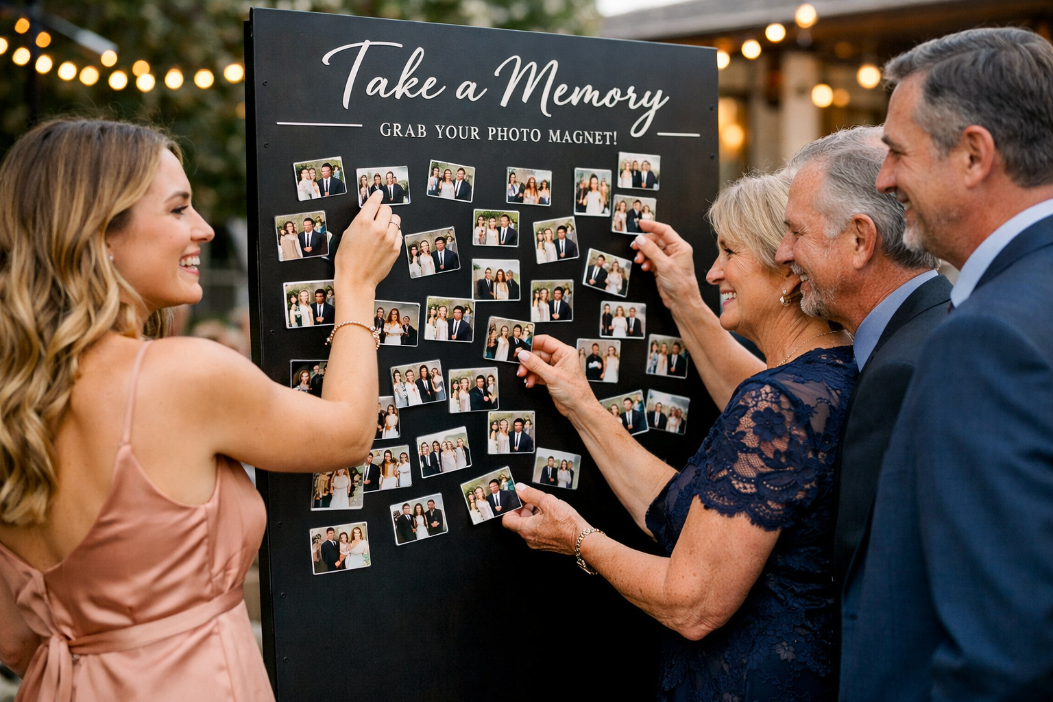 We take professional photos and, within minutes, they are printed and mounted on high-quality magnets for guests to grab from a display board. It combines entertainment with a premium wedding favor. Your guests refrigerator will become a gallery of your wedding day for years to come.