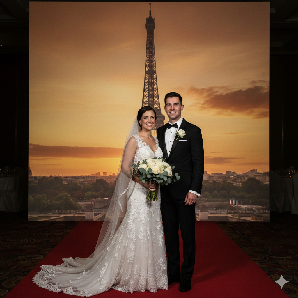 Using AI-powered background removal, we can place your guests in front of a digital custom-designed photo set - no clunky green fabric required. If you have a specific theme (e.g. Midnight in Paris or Tropical Glam) we can make the background perfectly match your vision without the cost of a physical 3D build.